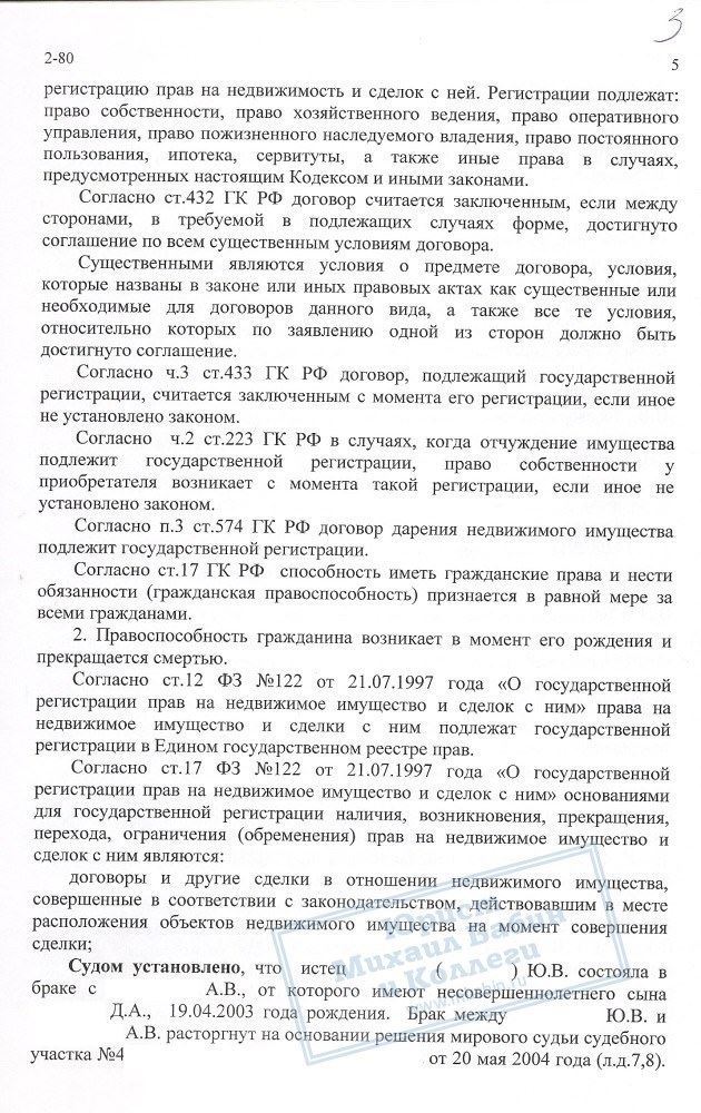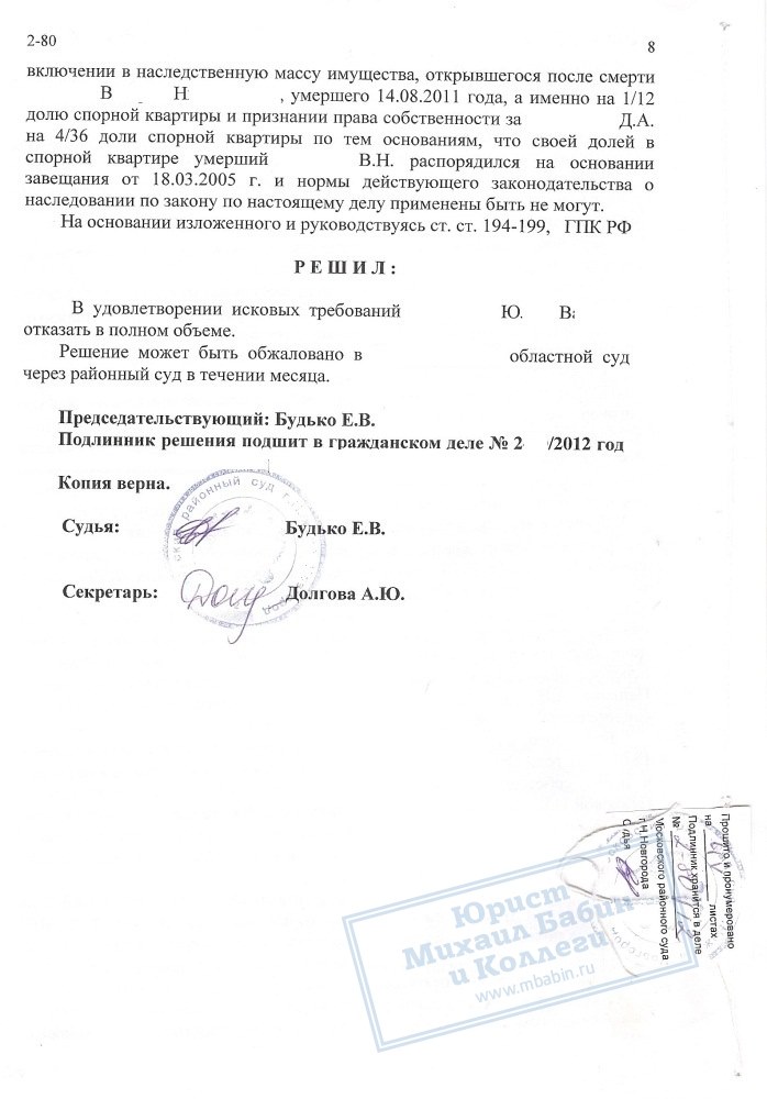 В ходе судебного заседания установлено, что дата регистрации договора дарения в реестре совпало с датой смерти, однако заключен он был при личном участии А.В. и Н.В., все нормы и правила регистрации были соблюдены. Из этого следует, что договор не может быть признан незаключенным. Рассмотрев все обстоятельства дела, суд вынес решение об отказе Ю.В. в удовлетворении исковых требований в полном объеме.