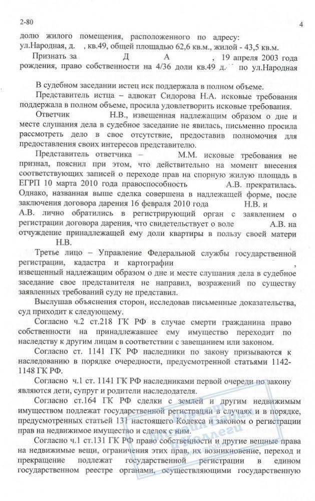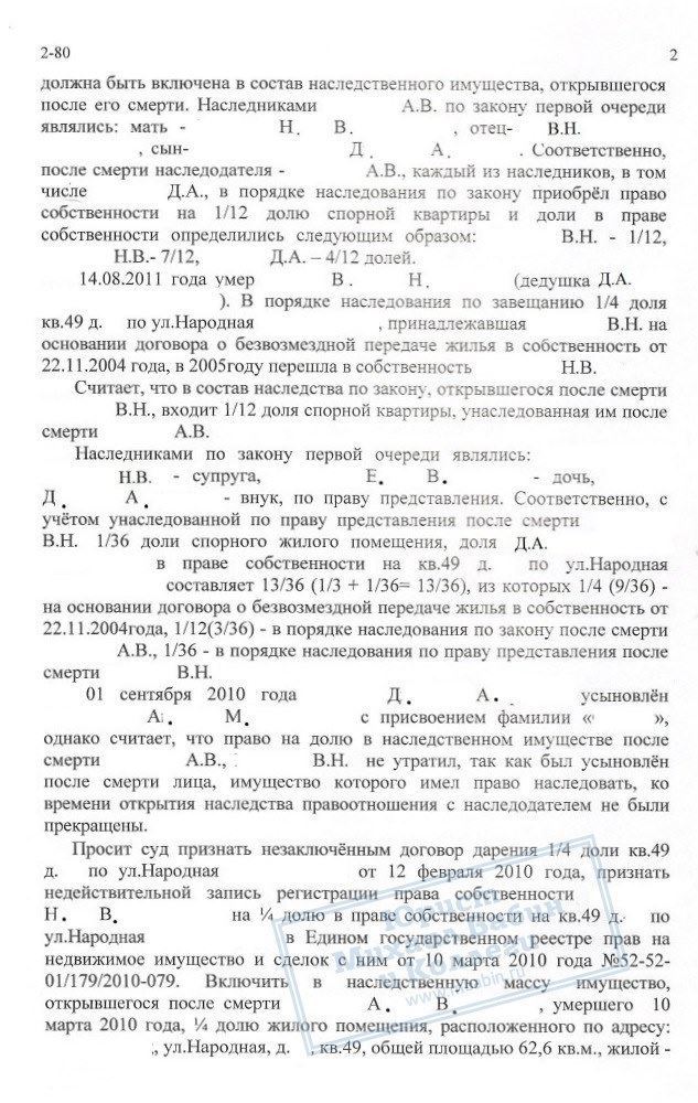 10.01.2012 гражданка Ю.В. обратилась в суд с иском к нашему клиенту Н.В. Требования состояли в том, что после смерти её бывшего супруга А.В. (он же сын нашего клиента Н.В.), ее несовершеннолетний сын Д.А. (уже усыновленный ее новым мужем) имеет право на долю в наследстве.