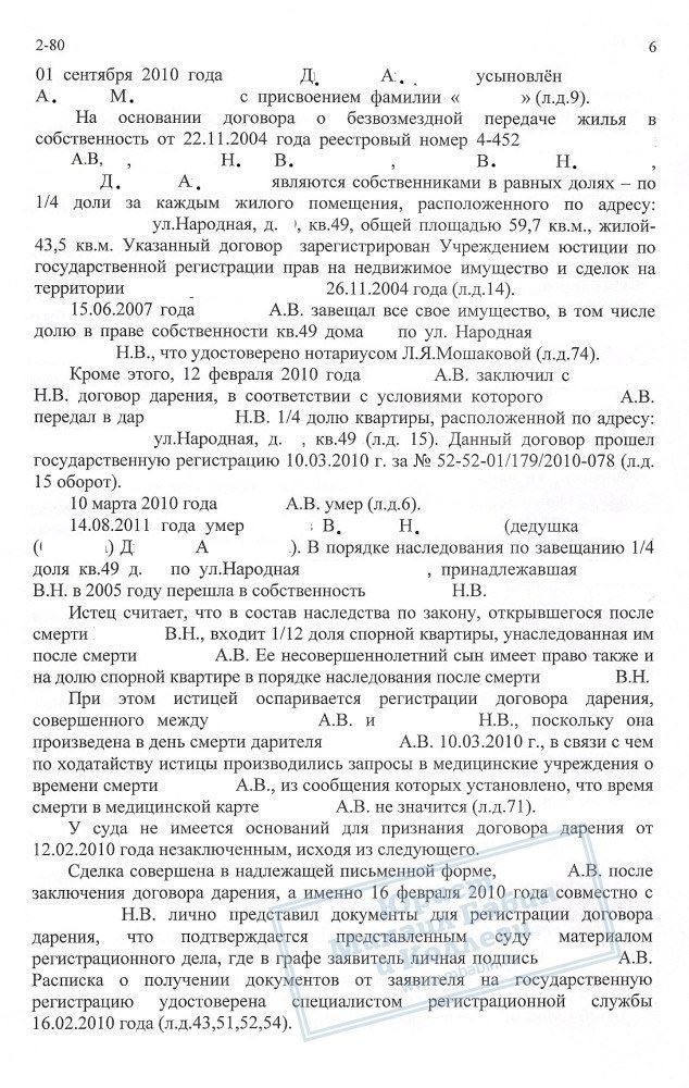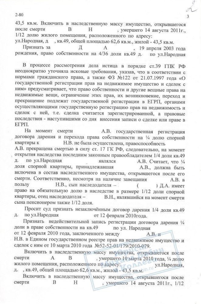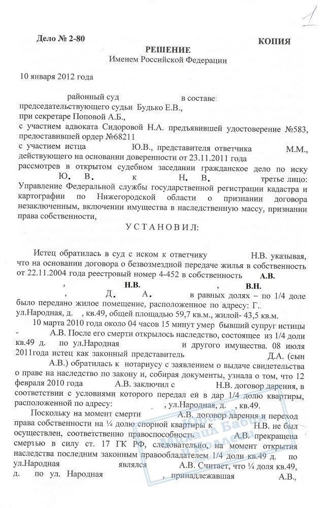Договор между умершим и его матерью Н.В. о дарении его доли в квартире истица требовала признать незаключенным. Интересы ответчика Н.В. представлял руководитель компании, который исковые требования не признал.